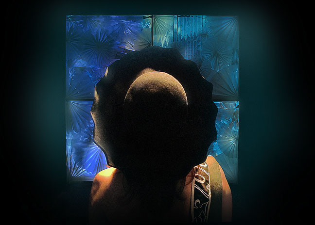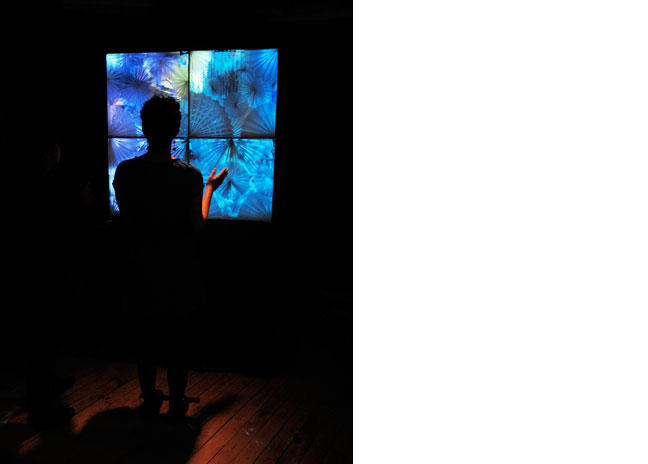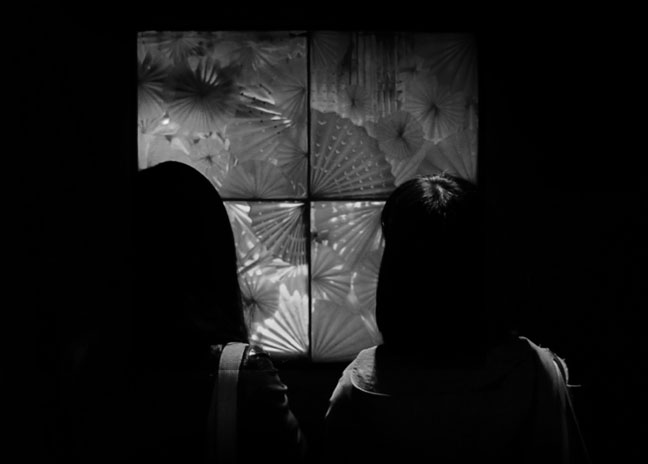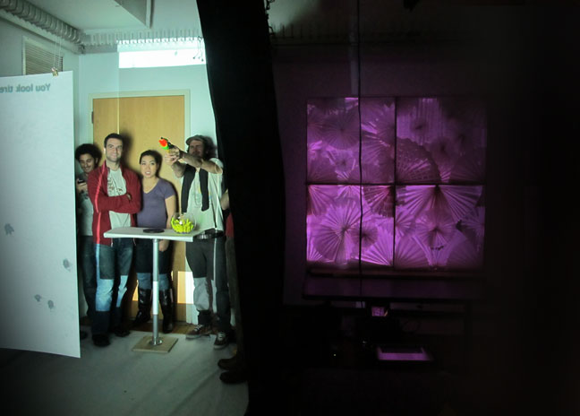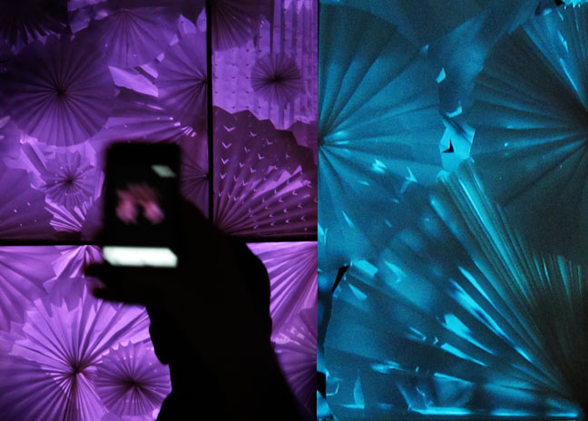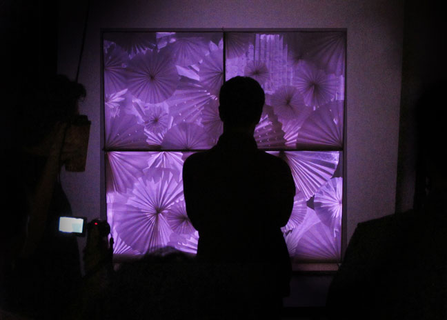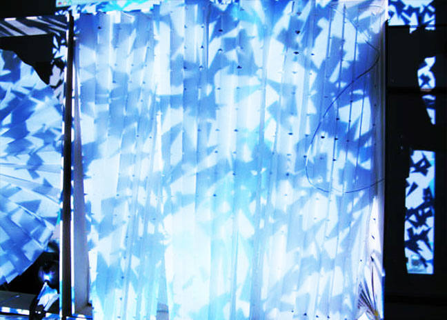 ‘Papel’ is a retail and decorative display that mixes paper, illusion, and art. This display consists of four 24 inch × 24 inch frames, filled with paper-folded art, composing a 2 ft × 2 ft grid. Behind the piece, there is an abstracted video projection via a hidden web camera. Using a infrared sensor to detect human proximity, the wallpaper radiates a soft blue glow until a viewer stands in front of the installation, in which case the sensor is activated and the blue glow fades away to reveal an abstracted projection of the viewer’s image. What is left is a relaxing, meditative, magical visual experience – an art piece that comes to life only with a human’s presence.